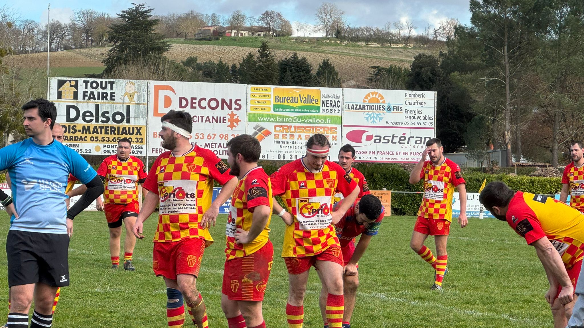 Comme pour le match de la réserve les joueurs de l’équipe première entrent sur le terrain, encouragés en musique par les jeunes d’Ovalis. Mais l’entame de match est totalement différente. Miramont domine et inscrit les premiers points pour mener dès les premières minutes 0/5, score conforté ensuite par une pénalité en leur faveur (0/8). Les cartons tombent contre un début d’indiscipline reproché aux locaux, le premier dès la première minute et le second à la sixième ! Heureusement, les Rouge et Jaune se ressaisissent , et marquent leur premiers points réduisant le score à 3/8. Mais ce sont les lot et garonnais qui vont convertir à leur tour une pénalité et marquer un essai transformé pour mener à la 28ème (3/18). Ce score reste inchangé jusqu’à l’approche de la mi-temps. C’est alors qu’à la suite d’une escarmouche de dernière minute et de nouveaux cartons (dont deux rouges pour le SCAC et un rouge pour Miramont), le bilan est que les Cypriotes terminent cette première période à 12 contre 14 et devront jouer la seconde mi-temps à 12 (10mn) puis 13 contre 14. Même diminués en nombre, ils ne sont pas diminués en courage, ne renoncent pas et repartent à l’offensive. Mais malheureusement sans trouver de solution face au jeu très agressif et provocateur de leurs adversaires. Le staff procède à plusieurs changements afin d’injecter un peu de sang neuf mais cela n’arrête pas Miramont qui inscrit un nouvel essai et creuse l’écart au score 3/23.