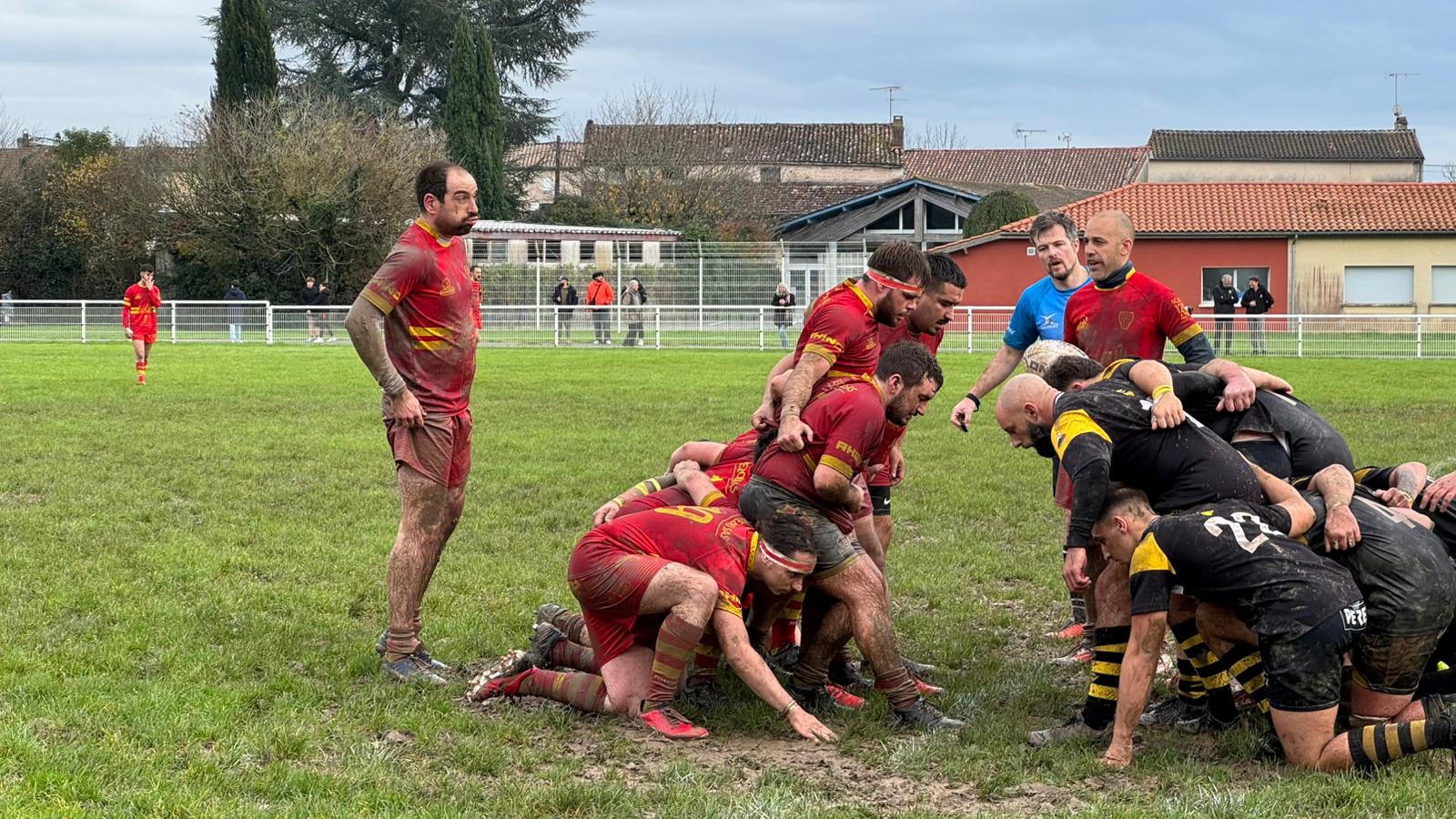 Le début de la seconde période rappelle le début du match avec des actions offensives des locaux et des fautes des deux côtés (6/3). La boue n’est pas favorable aux Sang et Or, et Castelmoron réussit à inscrire le seul essai transformé de la partie. Cet essai, ajouté à une dernière pénalité porte le score à (16/3). Les rouge et Jaune, ne se découragent pas et se battent jusqu’à la dernière minute sur la ligne des 5 mètres des locaux pour tenter, sans succès, de réduire le score en leur faveur.
